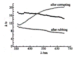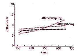 图1 表明,织物经摩擦及盐雾腐蚀后其K/S值也发生明显的变化,但这并未影响到它原有的良好吸光率(见图2,摩擦及盐雾腐蚀后,织物的反光率仅9%左右,即吸光率约91% ).