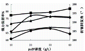 从表3中可以看出,随着pu2F用量的增加,整理后织物的折皱回复性增大。当pu2F的用量超过30g/L时,织物的折皱回复角变化不大。随着整理剂用量的加大,断裂强力保留率和撕破强力保留率都有所增加。