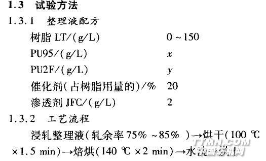 免烫整理可改善纯棉织物的服用性。但单独使用树脂进行免烫整理交联时,高温和酸性催化剂会促进纤维素大分子降解,使得整理后织物的强力下降比较严重。纯棉薄织物的基础强力绝对值较低,免烫整理后织物强力下降会更严重。因此,既保证达到免烫效果又不降低织物强力保留率是企业生产中急需解决的问题。 聚氨酯(PU)是分子结构中含有一NHcOO一单元的高分子化合物,它具有良好的成膜性和弹性,在免烫整理中作为添加剂,可以明显提高织物的回弹性,减少强力损失。 本试验将聚氨酯和免烫树脂复配,用于免烫整理,研究了相关工艺条件和影响因素 刮,以使整理后的织物具有高强力保留率和理想的免烫效果。1 试验部分1.1 材料和仪器织物14.8 tex×14.8 tex 524根/10 cm x283根/10 cm半漂平纹棉织物。药品免烫树脂整理剂LT,水溶性聚氨酯交联剂PU95,水溶性聚氨酯交联剂PU2F(上海市纺织科学研究院)。设备KLFH—K型轧车,电子天平(上海光正医疗仪器有限公司),YG541 B型织物折皱弹性测试仪(宁波纺织仪器厂),Pro—Tear织物撕破强力机(美国Thwing—Albert公司),HIOKS万能强力机(英国Hounsfield公司)。1.2 测试方法 织物断裂强力和断裂伸长率采用H10KS万能强力机,按GB/T 3923.1一l997《纺织品织物拉伸性能第一部分:断裂强力和断裂伸长率的测定条样法》进行测试,测织物3经3纬,分别取平均值。 织物撕破强力 采用Pro.Tear织物撕破强力机,按GB/T 3917.1—1997《纺织品织物撕破性能第l部分:撕破强力的测定冲击摆锤法》进行测试,测织物3经3纬,分别取平均值。 织物折痕回复性采用YG541B折皱弹性仪,按GB/T 3819-1997(纺织品织物折痕回复性的测定回复角法》测