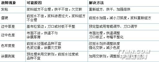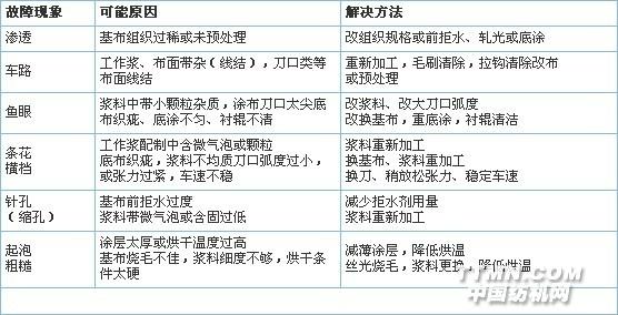 二、几个非常关注的话题:1.与其它纺织品后整理工艺不同,涂层整理工艺有更多的“灵活多样”性,这与其最终产品密切相关。2.涂层整理工艺更趋复杂、精细。除传统的湿法、干法、泡沫、转移、层压等方式外,往往还结合诸如轧光、磨毛、水洗、揉化、压纹等整理技术,使产品更趋个性化(又如:两面功能效果等等)3.涂层生产常见故障、可能原因及解决方法,请见附表