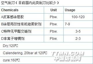 本方法目前应用于棉材质上,配方用量需依材质种类和手感要求而进行调整。A为皮革感涂层胶,可直接应用于各类纺织品,具有手感改善效果和良好的透气性。B为涂层用改性有机硅柔软剂,可赋予织物高端手感和悬垂性。C为特种无甲醛交链剂,可于150度进行交链,大幅提升涂层的性能。D为非离子增稠剂,适用于各种PH范围,耐硬水,电解质,具有非常好的流动稳定性。实际操作时出现的问题可以完全参照我提供的解决方法关键一:刮浆的流变性有一定的学问,没接触过涂层的人,要有一段的摸索时间,其次增稠剂很特别的。关键二:这种整理效果好坏的另一关键,刮刀,以效果排列:空气刮刀最好,磁力刮刀其次,常用的悬挂刮刀