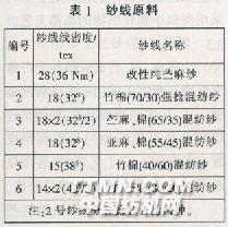 1原料 选用改性纯苎麻纱、竹浆纤维强捻混纺纱以及麻、棉等天然纤维混纺纱为原料来开发舒爽针织内衣面料,各种原料如表1所示。