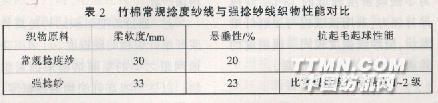 麻织物穿着挺括、凉爽、吸湿、透,.适合制作夏季服装,其独特的外观风格受到人们的青睐。但是纯麻纱线刚度大,编织较困难,且有刺痒感,影响贴身穿着的舒适性,因此可与其他柔软的天然纤维混纺,从而实现性能互补,改善服用性能。 由于1号纱线中的苎麻纤维经特殊处理,因此与常规麻纤维相比,纤维的初始模量降低,着色率较高,原料的回弹性和可编织性有所提高,且消除了刺痒感。 竹浆纤维是一种新型的纤维素纤维产品,正处于成长期,前景看好。竹浆纤维有很多优点,例如:手感舒适、滑爽、柔软,光泽和吸湿性好,悬垂性佳,对皮肤亲和,并具有一定的抗菌性。但竹浆纤维也有一些不足之处,例如:骨质软、湿强低、抱合性差等。为克服这些缺点,可采用不同含量的竹浆纤维与棉等纤维混纺或增加纱线捻度的方式。竹棉常规捻度纱线与强捻纱线织物性能对比见表2。就性能而言,竹浆纤维更适合于制作贴身服装。