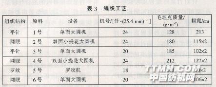 2织造2.1 编织工艺 根据表1中原料的特性,设计了几种组织结构,分别在单、双面大圆机上进行试织,部分面料的编织工艺如表3所示。