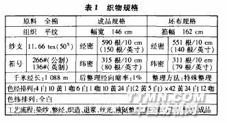 3 筒子纱染色 由于开发的产品为色织面料,必须先进行筒子纱染色。在染料的选择上不能使用受后道工序影响较大的染料,且必须考虑色牢度和沾色等问题。织物经过整理后,色纱的颜色变化应尽可能控制在最小范围,最好在筒子纱染色时做好变色方向的预测。调色时,注意染料组合搭配,对配方和工艺进行适当调整,以使颜色符合设计要求,色牢度达到规定标准。在染色时还要考虑筒子纱的卷绕密度、浴比、液泵的压力大小,以控制好色差、缸差等问题。4 准备和织造 由于是高支高密产品,对整经浆纱要求较高,应该做到张力均匀,毛羽伏贴。织造时应该注意温、湿度的调整,制