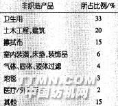在对非织造材料卷材加工成最终产品的调查中,发现卫生和个人护理产品占有最大份额。这类产品的消费量非常高,因为这些应用中包括很多一次性使用的产品。如纸尿裤和擦拭布(表1)。卫生和个人护理领域应用的非织造材料通过后整理所具有的性能主要有:-亲水性;-耐久的亲水性;-柔软性;-吸收性;-合适的复合性能,例如:亲水性与柔软性。表1 非织造材料终端应用情况