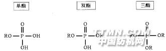 图1 有机磷酸酯类有机磷酸酯在抗静电剂、润滑剂、乳化剂和表面活性剂方面都能起一定作用。在单个、双个和三个磷酸盐基之间有些差别(图1)