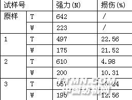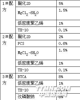 2.结果和讨论在本实验中,采用低密度聚乙烯作为柔软剂。它对提高织物的撕破强力和耐磨强度特别有效,而且具有耐高温不泛黄、不影响特白型织物的白度和染色、印花织物的色光等优点[4]2.1强力从表1可以看出,在用醚化2D工艺时,织物的经向和纬向的强力损伤都较大,而采用(PCS+醚化2D)工艺和BTCA进行处理时,强力的损伤有大幅度的减小,(PCS+醚化2D)工艺的强力损伤比BTCA工艺的还要小。表1 各整理方法的强力损伤.jpg)