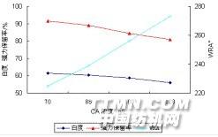 2.试验部分2.1试验材料2.1.1织物及其基本性能经退浆、煮练、漂白的本色纯Richcel平纹机织物,其基本性能:折痕回复角181°;经向断裂强力是481N,纬向则为300N;白度值65.02(甘茨)。2.1.2试剂和药品 柠檬酸(CA),次磷酸钠(SHP),三乙醇胺(TEA),氢氧化钠,硫酸,这些药品均为分析纯;柔软剂LD 6520,石家庄环城生物化工厂2.1.3仪器和设备 实验用小轧车(日产NM一450型);焙烘机(日产DK-5E型);WSD-Ⅲ型白度仪(北京康光公司产);YG06型电子织物强力仪(莱州)2.2 工艺试验 整理液处方 (g/L) 柠檬酸 70~120 次磷酸钠 与柠檬酸的质量比6:7 柔软剂LD 6520 10 三乙醇胺 15~30 整理工艺条件二浸二轧(轧余率80%左右)→预烘(90℃,2min)→焙烘(150~190℃, 90~200s)2.3性能测试折皱回复角:按GB 3819-97方法测定;白度: 按GB8425-87方法测定;断裂强度: 按GB3923—83方法测定。