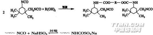 1·2 聚氨基甲酰磺酸酯的制备[4] 将聚醚多元醇于11O℃抽真空脱水处理2h,然后加入IPDI,控制反应温度恒定(误差±1℃),当预聚体中NCO%达到理论值时,即达到反应终点,降温得到预聚体。 在预聚体中加入一定量乙酸乙酯,预聚体分散均匀后加入一定量乙醇,立即加入量比n(NCO):n(HSO3-)为1:l的NaHSO3的水溶液,体系由混浊变为澄清,继续搅拌一段时间后得到了NaHSO3封端的聚氨基甲酰磺酸酯溶液。1·3 防毡缩机理[5] 利用聚氨基甲酰磺酸酯进行防缩整理后的羊毛织物,在一定温度及催化剂的作用下,封闭的-NCO释放出来,恢复活性