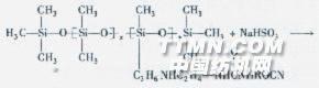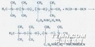 1 试验1.1药品和材料 药品乳化剂III-AF、醚化2D树脂EFR-3C(树脂中已加入催化剂)、纤维保护剂HI-40、环氧基硅油AV一920(以上均由深圳先进华联提供),专用氨基硅油、异佛尔酮二异氰酸酯(IPDI)、异丙醇、亚硫酸氢钠、冰醋酸、USV(BAYER提供弹性体,含固量28.0%)、EsPOLY 100(ESHIN提供弹性体,含固量99.1%)、POLY100催化剂CAT 100(ESHIN提供,含固量11.1%)。 材料 全棉平纹半漂布14.76 tex x 14.76 tex523根/10 cm×283根/10 cm1.2合成原理及合成方法 利用异丙醇降低硅油的黏度,然后用异氰酸酯与其反应,反应式如下: