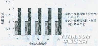 图6三项试验引起异味排序表以上表中的工艺编号对应的工艺见表3。三项实验结果表明:碱剂的纯度也不是引起异味的原因;此氯化防缩工艺必然引起异味,整个工艺过程中还原剂的种类不同,产生的异味差别并不大。3.4单、双项实验结果对比 5位后整理专业人士将单项和相对应的双项实验所引起的异味大小排序情况见图7、8、9。