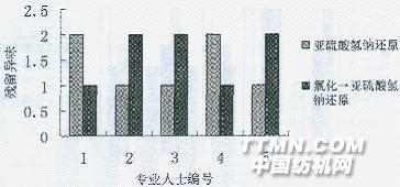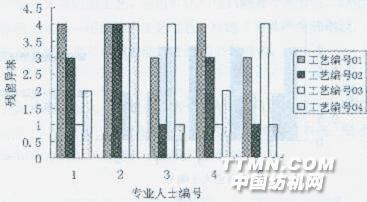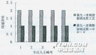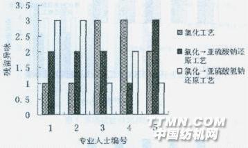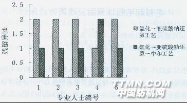 图5双项试验还原剂不同(分析纯)引起异味排序表 双项实验结果表明:还原剂的纯度不是造成异味的原因;氯化后,还原过程用亚硫酸钠或亚硫酸氢钠都引起异味,两者差别不大。3.3三项实验结果 5位后整理专业人士将4种工艺处理出来的异味大小排序情况见图6。