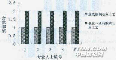 图1 0还原剂用亚硫酸钠双项和三项工艺产生的异味对比表