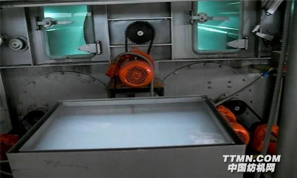 4 结构特点针织物平幅连续化水洗设备要进行连续化加工必须满足无张力或者低张力、无卷边的方式才能实现大批量的连续化生产。从以上结构图中我们可以了解到:前区配备了4个双振荡轮水洗单元,外加2个单转鼓轮水洗。第一格为温水预洗,织物在经过第一格双振荡时,用温水先行浸润,然后再经过第二格、第三格,这三格水槽中均含有一定浓度的除油剂,被处理的织物在这二格水槽经过时,上面的大转鼓上有几个强喷淋管,强水流直接打到运行的布面上,在布进入到液下时,水中的二只双振荡鼓自内而外的产生水流,从而达到清水、浊水充分交换的目的。(图1)