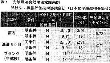 努民、钟建军、李文秀 丸山贞夫下面报告为我公司在北京室内装饰协会,中国室内环保产品质量监督检验中心所做100%棉织物经光触媒处理后,在2 支40W 日光灯照射下,甲醛及VOC 分解实验,结果显示,经光触媒处理后的织物在普通日光灯照射下对甲醛及VOC 有明显分解效果。.jpg)