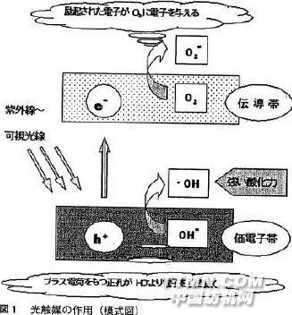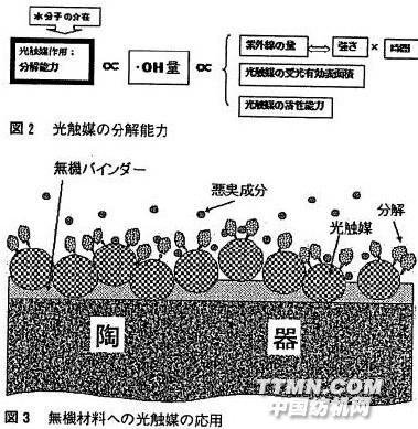 2、 光触媒应用的限制问题因光触媒有强烈分解有机物的特点,使其被局限于无机物制品上,如陶瓷、玻璃等,虽然能分解细菌、病毒、有机化合物等,但对有机底材也产生分解作用,因此,在有机纤维制品的应用领域受到很大限制,如何将光触媒的抗菌、除臭、防静电、抗紫外线、易去污、吸湿快干等功能应用于纺织纤维制品上,是光触媒科研人员多年研究的课题。主要问题是:TiO2 光触媒使用的溶胶强度、常温低压加工技术,特别是纤维制品耐热强度低,使常温、常压下光触媒的加工受到限制。如图所示; TiO2 光触媒在无机物上的使用图.jpg)