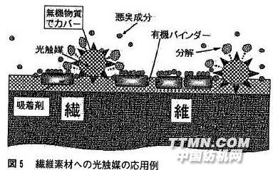 3、 光触媒在纤维加工制品应用问题的解决经多年的研究开发,我们解决了以下问题1)常温加工,使光触媒技术在纺织品领域应用成为可能;2)采用无机物作为缓和材,抑制有机底材的劣化;3) 触媒与溶胶的完美结合,解决了附着强度问题,同时,触媒又有足够的分解空间。如图所示: