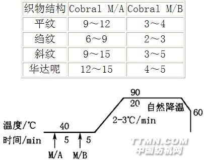 2 Arostretch弹性处理2.1 对织物的基本要求 此方法只适用于机织物,纱线捻度至少≥650,最佳捻度为≥850(64/2Nm)。混纺纤维比例不超过25%,否则弹性效果不明显。织物结构对弹性效果的影响占45%,平纹、斜纹、绉呢等不需要改变织物结构,而单面华达呢的纱线密度应减少15%左右。2.2 处理方法 用溢流染色机或绳状染色机,浴比为1∶15~1∶20。参考用量见表1,工艺如图1所示。表1 弹性处理助剂参考用量