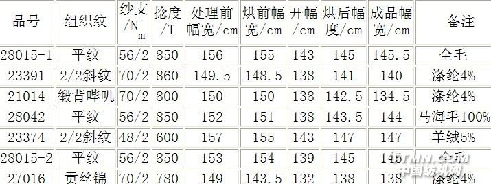 3 结束语 Arostretch弹性处理与羊毛/莱卡混纺毛织物均可使织物获得一定弹性,二者相比弹性处理具有以下优点:①不需要使用特定的纺纱和织造设备。②可使用国际羊毛局纯毛标志。③对于干洗很稳定(干洗4次莱卡会减低弹性20%)。④缝纫稳定性强(羊毛/莱卡混纺毛织物缩7%~8%,Arostretch弹性处理织物缩1.5%~3%)。⑤一种面料可选择做或不做弹性处理,减低库存。Arostretch弹性处理的缺点是弹性效果不如羊毛/莱卡混纺面料。经Arostretch弹性处理的织物纬向弹性为20%~24%,经向弹性为15%;羊毛/莱卡织物的纬向弹性为30%~35%,经向弹性为20%。Arostretch弹性处理对染料要求较高,一般染料处理前后原样色牢度变化在3~4或4级,色牢度较差。若来样加工,建议采用可耐Arostretch弹性处理的染料,如兰纳素染料。