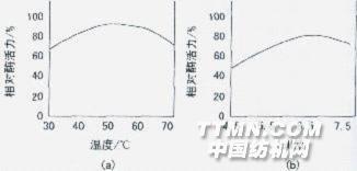 2 结果与讨论2.1正交试验 根据工厂生产经验和纤维素酶DL生产厂商提供的工艺参数,温度、pH值对纤维素酶DL相对酶活力的影响规律,如图1所示。
