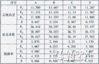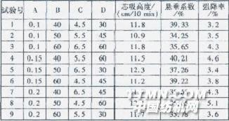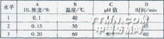 图1温度、pH值对纤维素酶DL酶活力的影响 由图1可知,温度在40~60℃、pH值为4.5~6.5时,纤维素酶DL的酶活力相对最好,固定酶洗柔软整理的浴比(1:20)和渗透剂JFC浓度,进行L9(3 4)正交试验,见表1~3。表1 L9(3 4)正交试验因素水平表