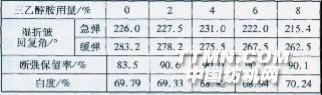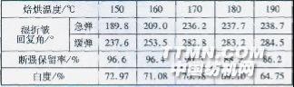 由表6可以看出,焙烘时问增加,真丝绸折皱回复角大大提高,而织物的白度和断裂强力降低。这是因为焙烘时间增加,柠檬酸分子中相邻羧基脱水形成酐的几率增大,与真丝绸纤维分子上的氨基、羟基与水解淀粉上的羟基发生酰胺化和酯化反应的程度充分提高,织物防皱性能明显增强。但对织物白度和断裂强力有