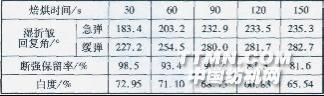 柠檬酸呈酸性,高温下与纤维交联的同时,也会导致纤维素发生脆化,且部分柠檬酸会失去二氧化碳和水生成乌头酸和衣康酸,乌头酸和衣康酸又会进一步反应形成柠康酸,这三种酸的分子结构中均内含有双键,受高温作用,会引起织物泛黄。故焙烘温度愈高,织物强力损失愈大,白度愈差。综合各项性能,焙烘温度以170℃较适宜。2.1.6焙烘时间对真丝绸性能的影响改变焙烘时间,真丝绸整理后的性能见表6。 表6焙烘时间对真丝绸性能的影响