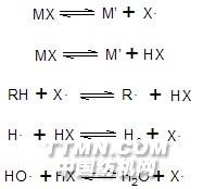 含卤素阻燃剂在高温下释放出卤原子和卤化氢,按下列反应消除自由基,抑制放热反应,产生阻燃作用: