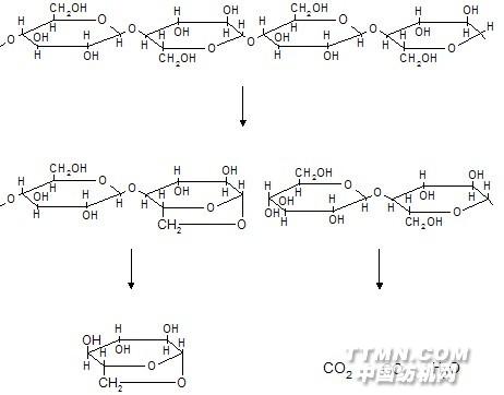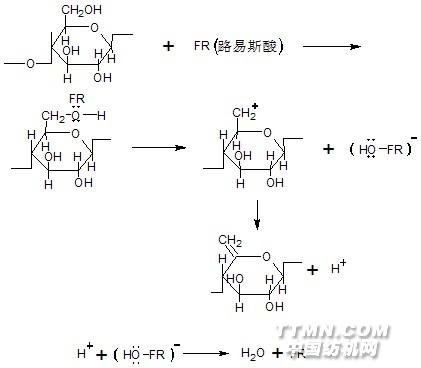 左旋葡萄糖一般认为磷酸盐及有机磷化合物的阻燃作用,是由于它可与纤维素大分子中的羟基(特别是第六位碳原子上的羟基)形成酯,阻止左旋葡萄糖的形成,并且进一步使纤维素分子脱水,生成不饱和双键,促进纤维素分子间形成交联,增加固体碳的形成。其他一些具有酸性或碱性的阻燃剂也有类似作用。脱水反应表示如下:酸催化脱水: