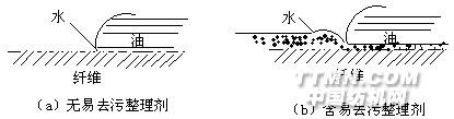 图6-1 水对疏水性织物上油污界面的扩散纺织品沾污的原因,除了纤维的疏水性容易产生静电对油污吸附的原因外,与纤维的亲油性也有密切的关系。油性污垢如不能将纤维“润湿”,也就不易沾附。当液体的临界表面张力小于固体纤维的临界表面张力时,液体油污就能“润湿”纤维。油性污垢的临界表面张力在30mN/m,(棉纤维的临界表面张力大于72.7 mN/m),所以涤纶(包括棉)容易为油性污垢“润湿”而沾污。另一方面亲水性的棉纤维浸在水中后,临界表面张力下降为2.8 mN/m,而疏水性的涤纶下水后的临界表面张力反而有所提高,所以涤纶沾上油性污垢后,不如棉纤维那样容易洗除,而且还易受洗涤液中污垢再沾污。