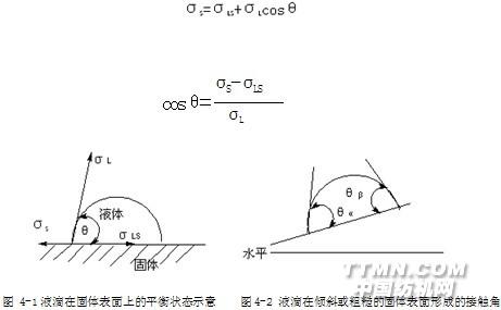 织物的润湿就是使水或溶液在织物表面迅速展开。一滴液体滴在固体表面上,会受到液体和固体表面张力(分别用σL和σS表示)以及液固间的界面张力(σLS)的作用,当液滴在固体表面处于平衡状态时(如图4-1),这三种力应满足下列方程: