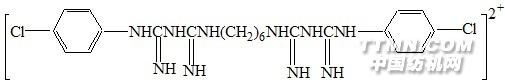 脲类和胍类有机卫生整理剂 特点是广谱抗菌,对真菌的抑菌效果好,低毒安全,是很有前途的抗菌剂。 如:3,4,4ˊ-三氯二苯脲;三氟三甲基二苯脲;烷基乙烯脲;1,6-二(4ˊ-氯苯双胍)己烷等都是很好的抗菌剂,有的可以作为防臭剂。 医疗方面应用很广泛的有1,1ˊ-六亚甲基双 [5-(4-氯苯基)双胍]盐酸盐或葡萄糖酸盐。结构式如下: