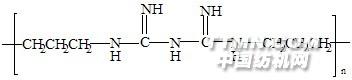 前者水溶性较低,耐洗性较好。主要靠破坏细菌的细胞膜达到杀死细菌的目的。双胍类对细菌抑制效率高,对真菌抑制效率低。该类产品有日本Leneum公司的商品“通勤快足”。它是使用1,1ˊ-六亚甲基双 [5-(4-氯苯基)双胍]二葡萄糖酸酯混入锦纶纺丝原液中,再纺成抗菌纤维。 聚六亚甲基双胍盐酸盐(PHMB)可以用于整理棉及其混纺织物。由Zeneca公司成功开发。结构式: