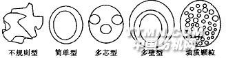图1 微胶囊形状结构微胶囊有多种结构,有的呈简单的囊泡结构,有的呈多重壁材包埋结构,还有的囊壁中分散多个囊芯,不同结构的形成主要由制
