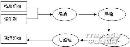 (2)催化剂采用氯化铵,国药集团化学试剂有限公司AR(沪试),含量≥99.5%。1.2技术路线阻燃织物生产的技术路线如图1: