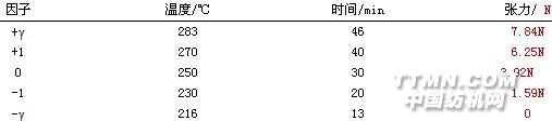 图1 阻燃织物生产的工艺流程1.3实验方案采用二次通用旋转组合设计来安排试验方案。该方法相对于传统的正交试验,具有试验次数少、计算简便,排除了误差干扰等特点;可以通过建立的二次回归方程预测和推算非试验点的结果,预测值更能反映客观情况。试验选取温度水平中心值为250℃,上下邻近的水平值相差20℃,分别为270℃及230℃.温度上下限的值利用公式250+20×γ,250-20×γ修正后得283℃和216℃。其他两个因子的水平确定方法与此类似。旋转组合设计因子编码表,见表2。表2 因子编码表(γ=1.682 )