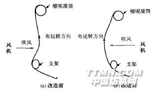 1 研发解决的技术难题1.1 缩呢设备的改进和洗缩工艺的调整1.1.1 设备改造意大利CIMI公司洗缩联合机(型号:F0TJATEx2C),原风机吹风是从前方向后吹(如图1(a)所示),这种结构布展幅空间小,织物被风吹后呈s曲线运动,不易抖开,易产生缩呢折痕,使成品因严重折痕降等。为了消除织物在缩呢过程中产生的折痕,对设备进行了改造。将风机位置移动,吹风方向改为从后向前吹(如图1(b)所示),这样布展幅空间大,织物在缩呢过程中被风吹后呈弧线运动,易抖开,减少缩呢折痕的产生。