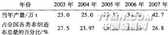 2 针刺法非织造布后整理工艺技术业内企业对于针刺法非织造布后整理技术已有所了解,但对整个工艺设计、操作等还是相当的陌生,做的好的企业全国也仅有2~3家。经研究,每家企业的生产工艺均大同小异。整个技术流程主要是以下步骤。表1 2003年~2007年针刺法非织造布产量分析