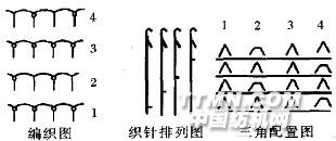 2 产品设计2.1 纬平针机型: 单面圆纬机; 机号: 28; 筒径:76.2cm (30in);路数:9O.路;横密:7O纵行/5cm;纵密:94横列/5cm;克重:204g/m2。2.2 单面集圈组织2.2.1 机器条件及上机工艺参数机型:单面四针道针织机;机号:26;筒径:76.2cm (30in);路数:9O路;克重:228g/m2。2.2.2 织物组织设计在单面四针道针织机上通过配置成圈与集圈相结合,在织物表面呈现规则的凹凸小网眼外观,增大了织物的表面积,可提高织物的散湿能力。图1织物上机图中分别列出了织物的编织图、织针排列图和三角排列图。.jpg)