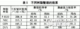 2 结果与讨论2.1 单因素分析2.1.1 不同树脂整理的影响不同树脂对整理效果的影响结果见表1。