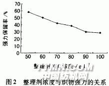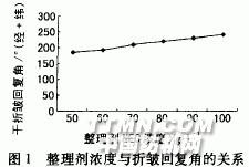 由表1知,NEC树脂整理织物的干折皱回复角(经+纬)最大,强力保留率也较好,因此选用低甲醛树脂整理剂NEC做进一步试验。2.1.2 整理剂浓度的影响.jpg)