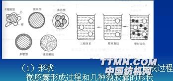 微胶囊定义:是指将某种物质用某些高分子化合物或无机化合物,采用机械或化学方法包覆起来,制成颗粒直径在1~500μm,在常态下为稳定的固体微粒,而该物质原有的性质不受损失,在适当条件下又可释放出来。 微胶囊组成:芯材 + 壁材。 芯材一般有以下四类物质: 水溶性或非水溶性的固体物质; 非水溶性的液体或气体; 溶液; 固体的分散液或分散的胶体物质。微胶囊纺织品功能整理:微胶囊技术用于纺织品功能整理加工,可获得常规整理无法得到的效果。这包括阻燃、防皱、防缩、拒水、拒油、抗静电、柔软、抗菌、杀虫、香气以及某些特殊的整理。