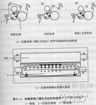 (1) 轧光整理轧光机主要由重叠的软硬辊筒组成,辊筒数目分2~10根不等,可根据不同整理要求,确定软硬辊筒数量与排列方式。织物穿绕经过各辊筒间轧点,即可烫压平整而获得光泽。 轧光时硬辊筒加热温度为80~110℃,温度愈高光泽愈强,冷轧时织物仅表面平滑,不产生光泽。 织物经过给湿后平幅通过轧光机,经湿热压作用,使织物光泽增加,手感柔软