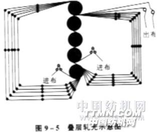 叠层轧光 五辊以上轧光机,如配备一组6~10套导辊的导布架,即可选行叠层轧光,利用织物多层通过同一轧点相互压轧,使纱线圆匀,纹路清晰,手感柔软,有似麻布光泽,