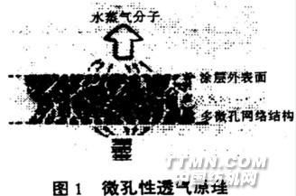 1、织物的防水透气机理 可分物理透湿和功能透湿,主要有以下4种方式。1.1、利用水滴的最小直径与水汽或空气的直径之间的差异来实现,即采用织物的经纬交织间的孔隙或织物复合物的孔径介于水滴最小直径与水汽或空气的直径之间,达到防水透气的目的。基于这一原理设计的防水透气的织物有超细高密织物、特高密度的棉织物等。这类织物的透湿类型属于纱线间孔隙的自然扩散。高密织物由于轻薄耐用,透湿性好,柔软,悬垂性好,防风,广泛用于体育、户外活动服装上。主要缺点是防水性差,由于织物密度大,织物的撕裂性能差,纺纱必须特殊处理,生产成本高,加工困难。1.2、采用微孔高聚物薄膜,使薄膜微孔(微孔直径大约lnm)的孔径介于水滴与湿气之间,将薄膜与织物复合赋予织物防水透气功能,如图1。
