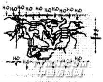 图2亲水性透气原理 亲水成分可以是分子链中的亲水基团或是嵌段共聚物的亲水组分,其防水性来自于薄膜自身膜的连续性和较大的膜面张力。用薄膜与织物进行层压/涂层赋予织物防水透气功能。1.4、利用形状记亿高聚物的特性。形状记忆高聚物在玻璃化转变温度Tg区域,由于分子链微布朗运动而使透气性有质的突变,而且其透气性能随外界温度的变化而变化,即智能化功能,尤如人体皮肤一样,能随着外界温湿