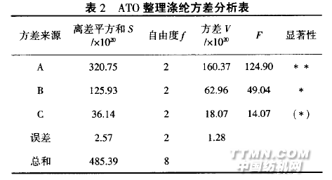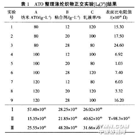 由表1及表2可知,纳米ATO粉体质量浓度对整理织物表面比电阻值的影响特别显著,粘合剂质量浓度影响显著,轧液率影响较显著,其优化方案是A2B2C1,即纳米ATO 100g/L,粘合剂20g/L,轧液率120%。考虑到实际操作中涤纶织物轧液率不易达到120%,故轧液率取100%,则优化方案是A2B2C2。对最优工艺进行验证,测得整理织物的表面比电阻值为9.28x109Ω,小于正交实验最小的表面比电阻值1.03x1010Ω。
