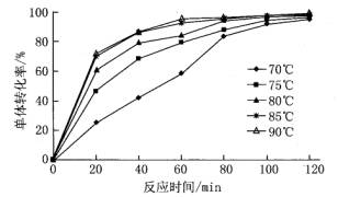 此外,从图2-1中各曲线可以看出:同一聚合温度条件下,转化率随着聚合反应时间的延长而增大,同一反应时间内,转化率随着温度的增加而上升。反应初期,单体转化率快速增加,反应一段时间之后,反应速率随时间的变化不大,转化率增加缓慢,表明聚合反应接近末尾。
