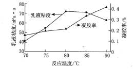 | 反应温度/℃ | 底液变蓝时间/min | 凝胶率/% | 乳液性能 |